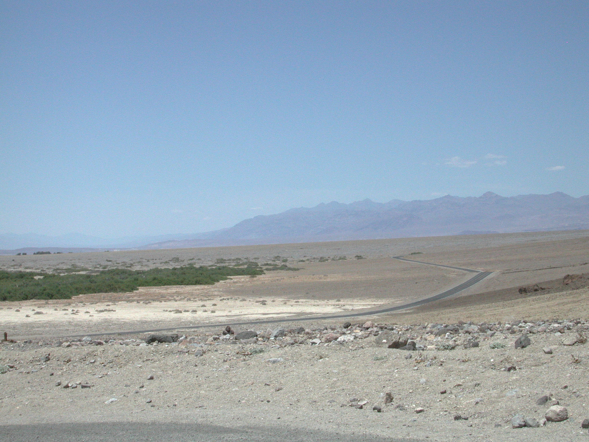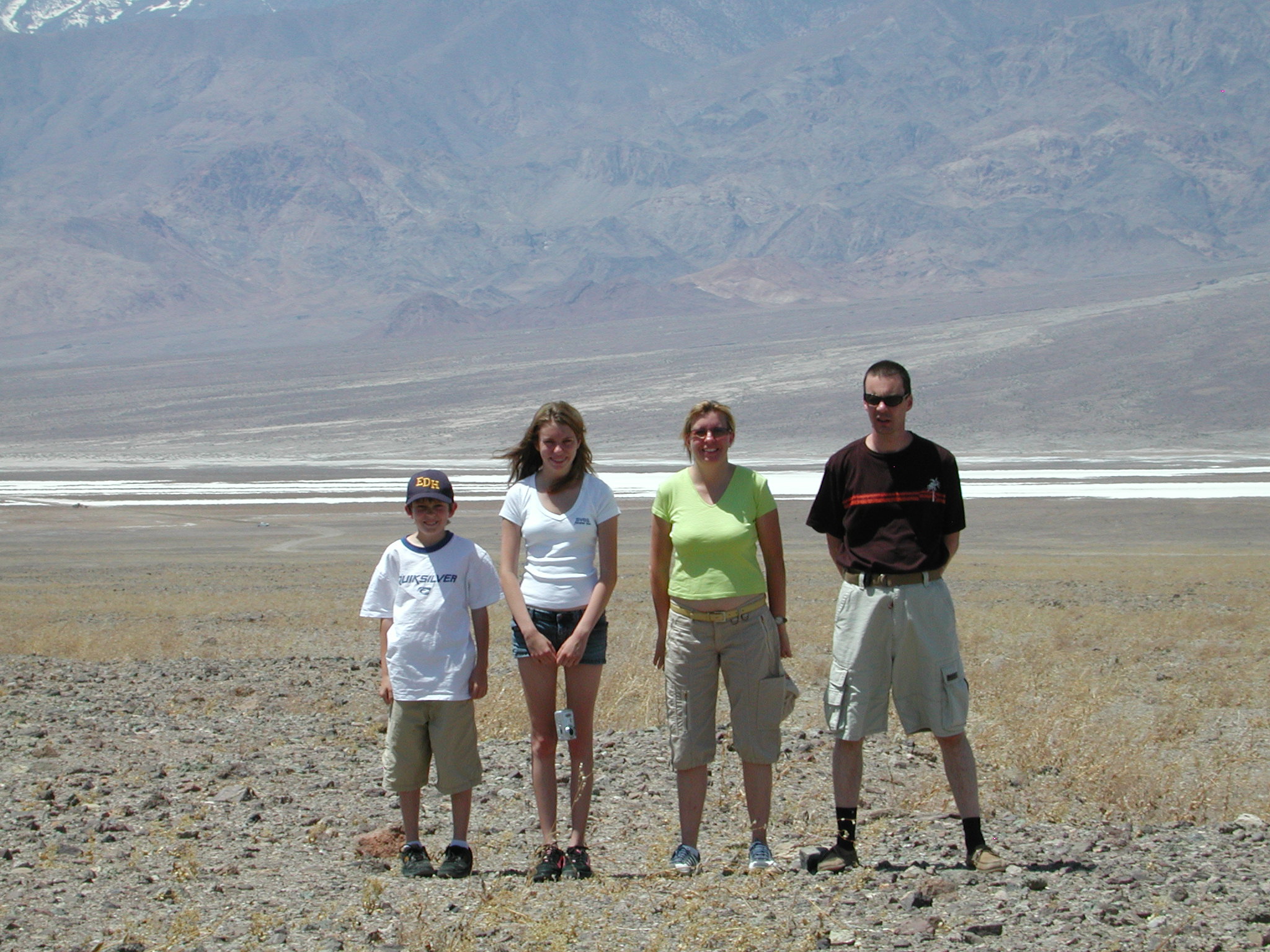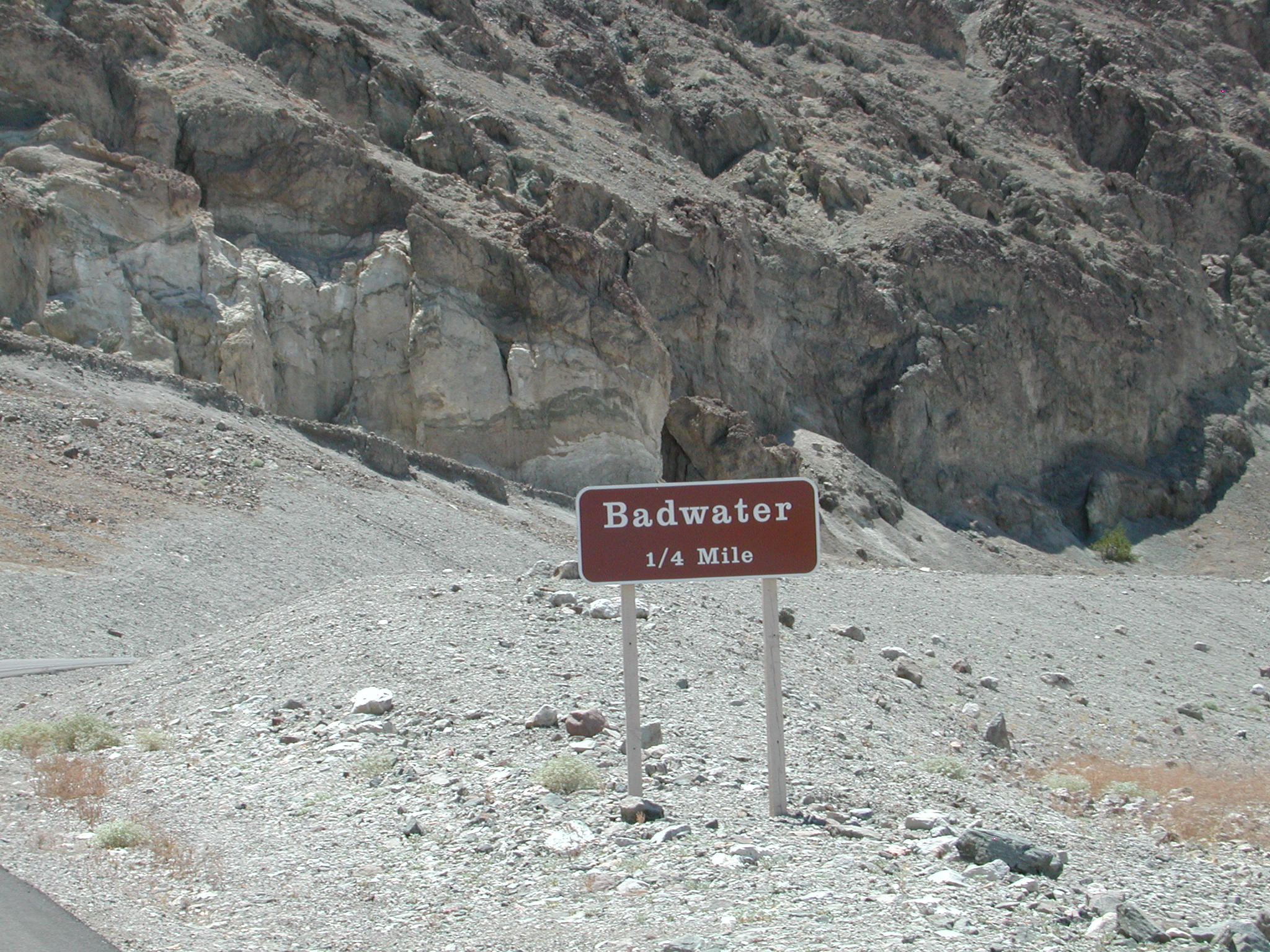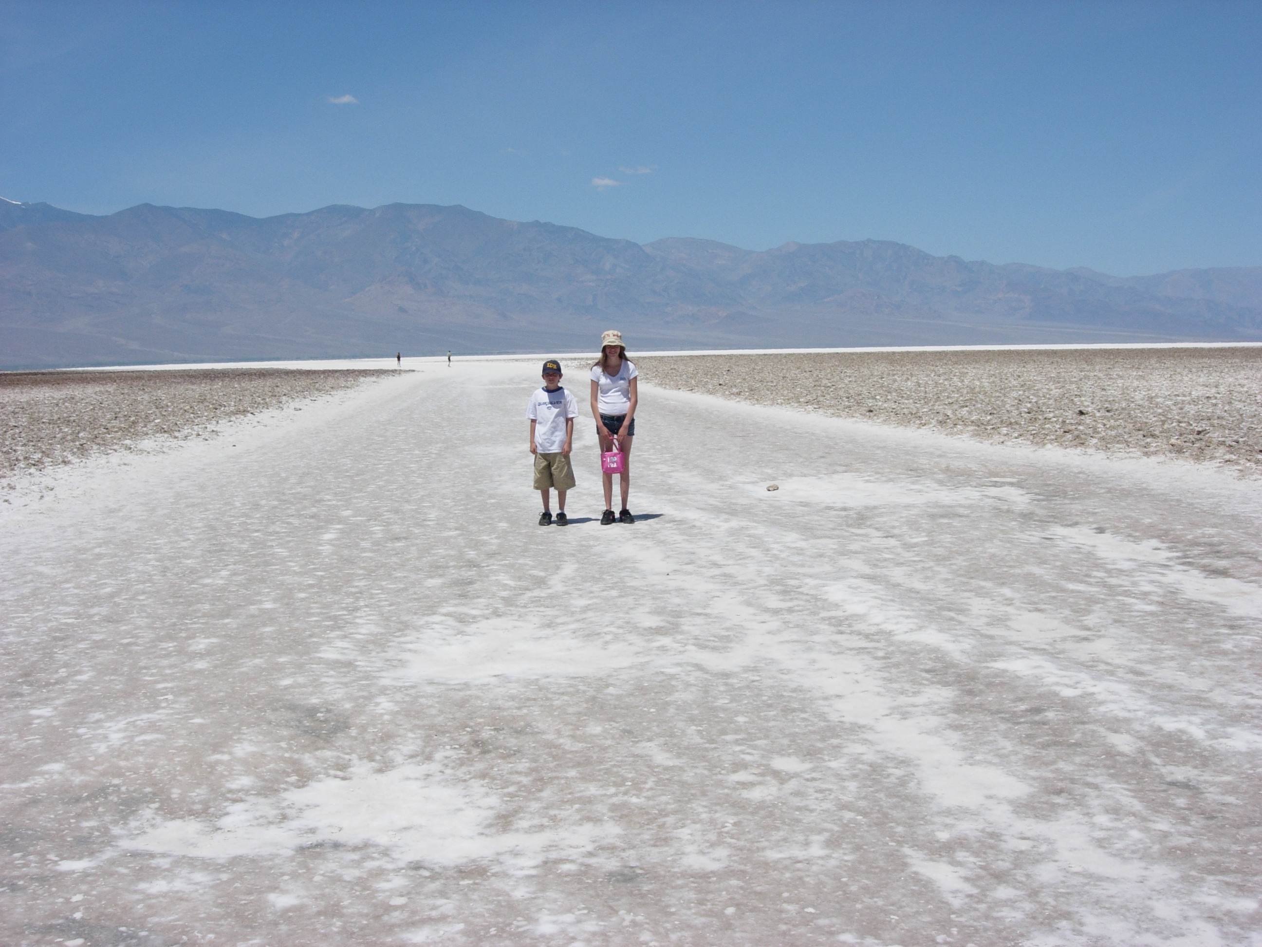 This day was set aside for roaming the valley, so we got in the car and drove over to Furnace Creek visitor center and looked around for a bit before continuing on to Badwater. My old Nikon Coolpix 990, or perhaps just the batteries, was not too happy with the heat though. Outside temperature approached 45C and even though the air conditioner worked flawlessly, the sheer radiation of the sun heated everything it touched to boiling and my camera refused to cooperate as we got down to Badwater. My wife had hers though so we got out on the salt to snap a few pictures. The kids forgot their sun-glasses and walking on the white salt in the intense sunlight just wasn’t possible so they turned back to the shade of the shelter by the parking. After spending a night and half a day down in the valley you come to realize that one of hottest places on earth means the heat is just merciless. No escape anywhere, the sun is more or less straight up and even at night the temperature is around 40C. And there were Shoshone Indians living down here before America was invaded – that is just amazing.
