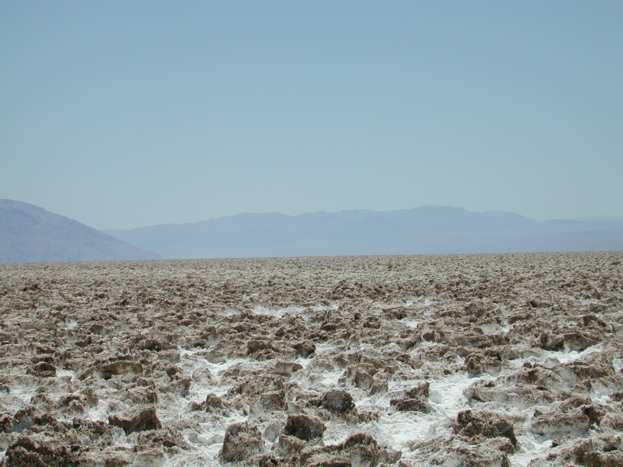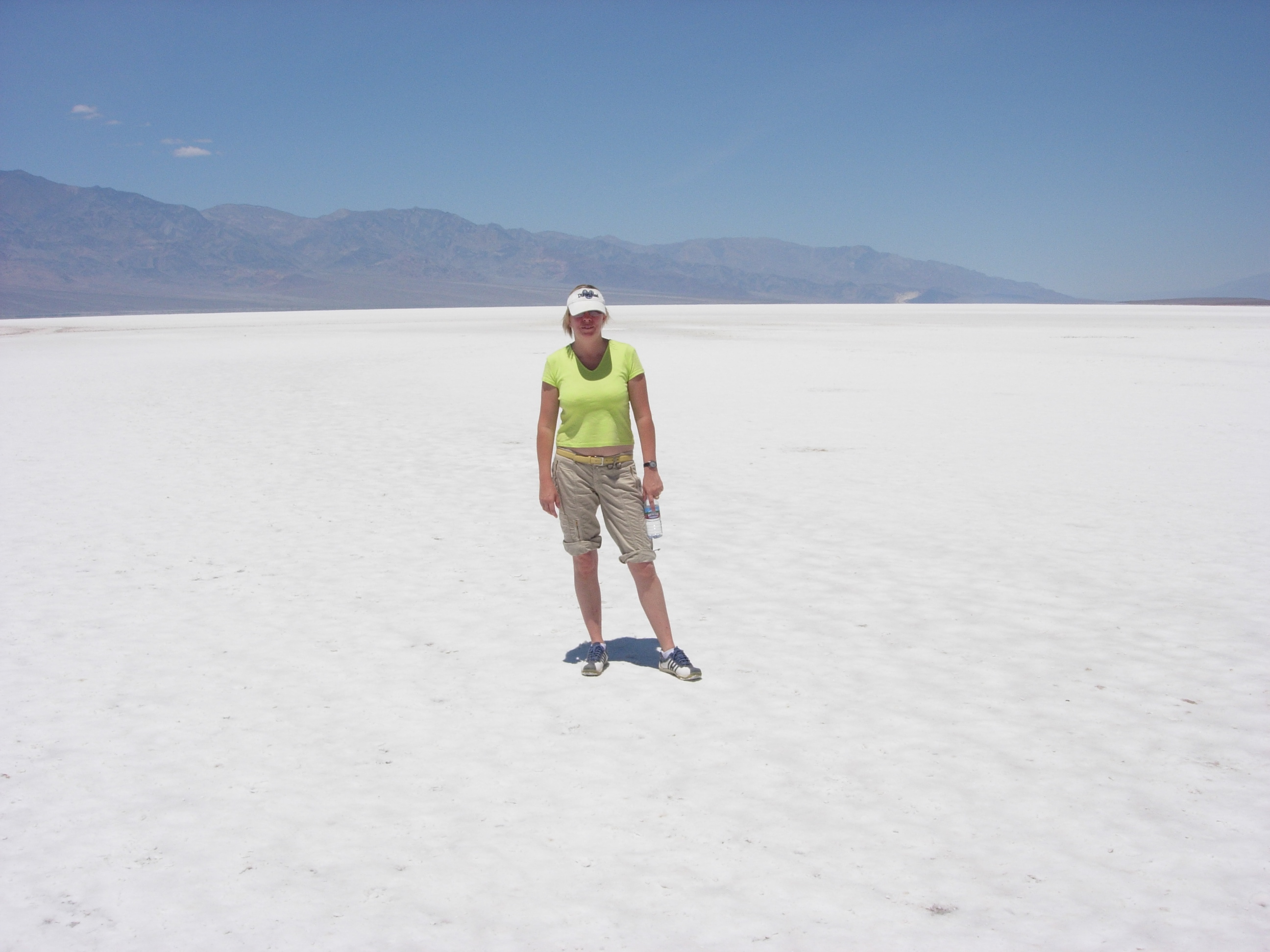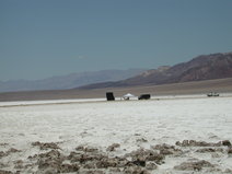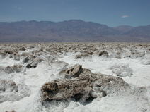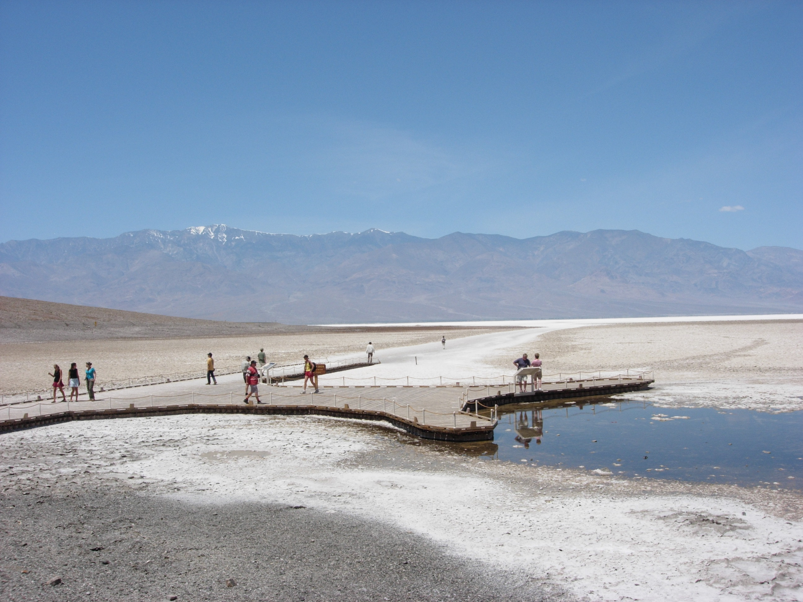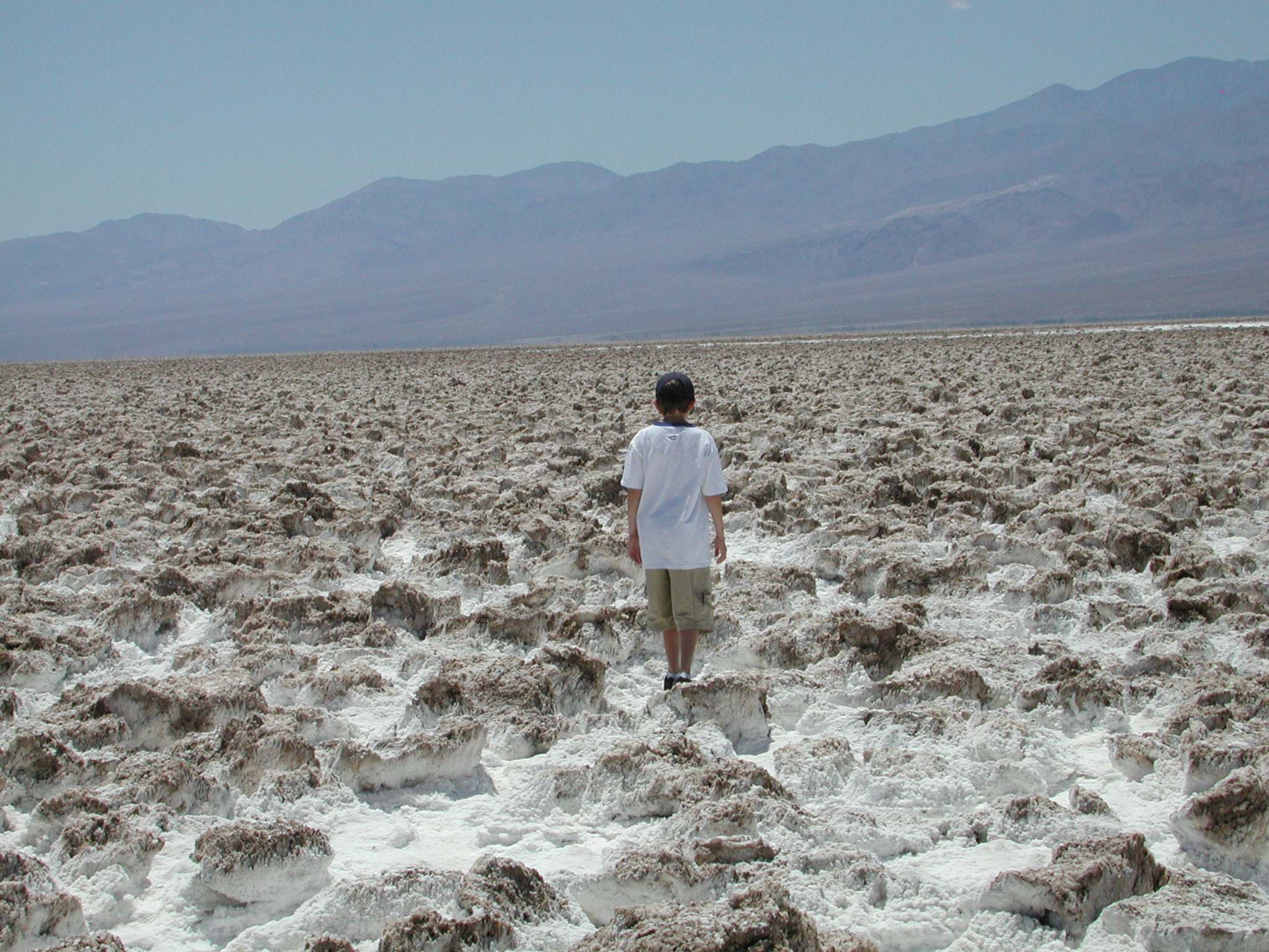 This day was set aside for roaming the valley, so we got in the car and drove over to Furnace Creek visitor center and looked around for a bit before continuing on to Badwater. My old Nikon Coolpix 990, or perhaps just the batteries, was not too happy with the heat though. Outside temperature approached 45C and even though the air conditioner worked flawlessly, the sheer radiation of the sun heated everything it touched to boiling and my camera refused to cooperate as we got down to Badwater. My wife had hers though so we got out on the salt to snap a few pictures. The kids forgot their sun-glasses and walking on the white salt in the intense sunlight just wasn’t possible so they turned back to the shade of the shelter by the parking. After spending a night and half a day down in the valley you come to realize that one of hottest places on earth means the heat is just merciless. No escape anywhere, the sun is more or less straight up and even at night the temperature is around 40C. And there were Shoshone Indians living down here before America was invaded – that is just amazing.