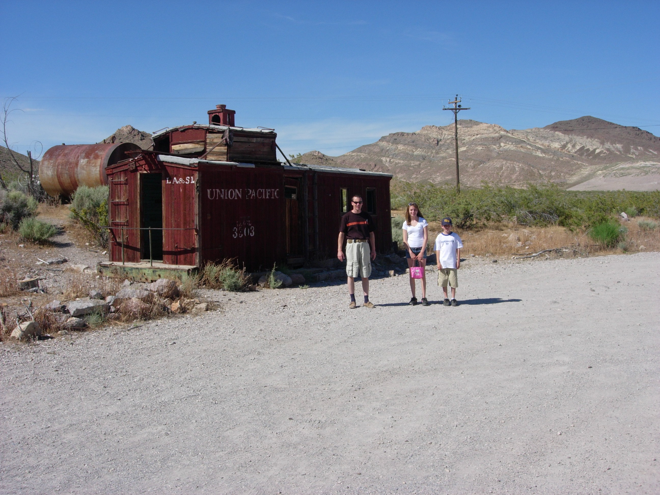 So we took aim at Beatty a little ways past Rhyolite and got there after about 30 minutes and found the sheriff’s office. I hoped they would either know the area or have a sense of humor as I walked up to the window and told them about the people that were stuck at Hell’s Gate. They did know the area and called the ranger station down in Death Valley. We took a swing around Beatty and topped up gas and cleaned the windshield before we started back towards Rhyolite. As we got up the gravel road we were greeted by a sign telling us to register, but the little building there was shut with a note about wet paint and an old man, apparently living with his wife in a trailer behind it, was walking behind the building. He didn’t make any attempts to socialize, but I approached him anyway and asked about the strange dam with its huge jets of water shooting in the air on the other side of the main road. He told me they were evaporating polluted water from an old gold-mine and I also learned from him that Rhyolite had had 10,000 residents in its glory days at the turn of the 19’Th century. Sure enough, as we got up there, there was an old rail-road station that must have been luxurious in its days. No tracks were left, but an old train-car and a semaphore gave hints of the past.
