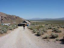 After a mile or so on our way to Rhyolite, an old man, maybe in his 80’s, waved at us from beside a parked car so we stopped and asked if he was okay. It turned out that he and a lady the same age and a younger couple had gotten stuck there, maybe from a not too uncommon vapor-lock and had managed to exhaust the battery. We offered the elderly a ride to get out of the heat but they preferred to stay with car, so for lack of anything better we promised to notify the sheriff or the rangers from Beatty which they were grateful for. As I asked the younger man about the name of the place, I looked around and before he answered I saw the sign “Hell’s Gate”. So this would be something like reporting a crime committed by seven little dwarves… We both laughed and agreed that it was better to be at the gate than past…